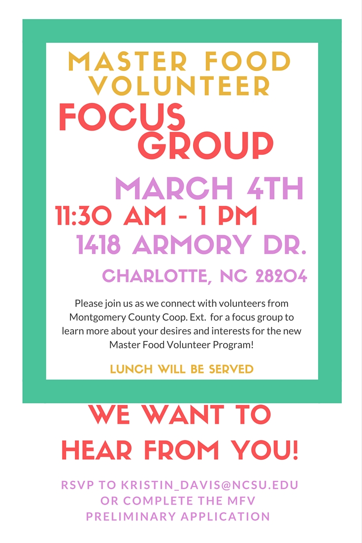 The Mecklenburg County Cooperative Extension Service Family & Consumer Sciences program is seeking 10 - 15 interested community members to volunteer as a part of the new Master Food Volunteer (MFV) pilot program with fourteen other counties from across the state. The MFV program, similar to the highly recognized Extension MasterGardener Volunteer (EMGV) program, is designed to provide volunteers the opportunity to support Family & Consumer Sciences (FCS) agents with food-related programming.
