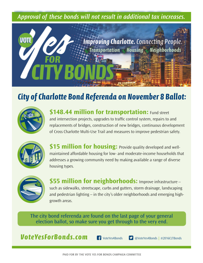 This November, three bond referenda worth $218.44 million are on the general election ballot to be approved by Charlotte voters. The financial costs for these bonds have already been planned for the city budget and will not result in higher taxes for Charlotte residents.