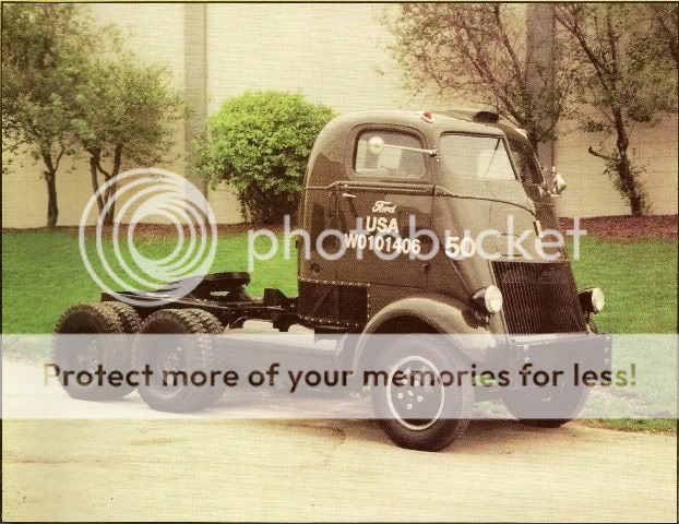 This is a 1942 Ford Thorco Dual Motors T8. Powered by twin Ford V-8 engines. Truck was constructed by a transportation company to perform special WW II tasks. These tractors pulled 63-1/2 foot trailers to move airplanes and glider subassemblies to plants throughout the U.S. There was about 100 of these trucks built |